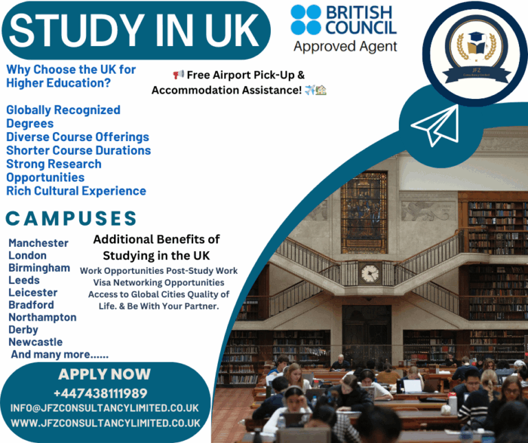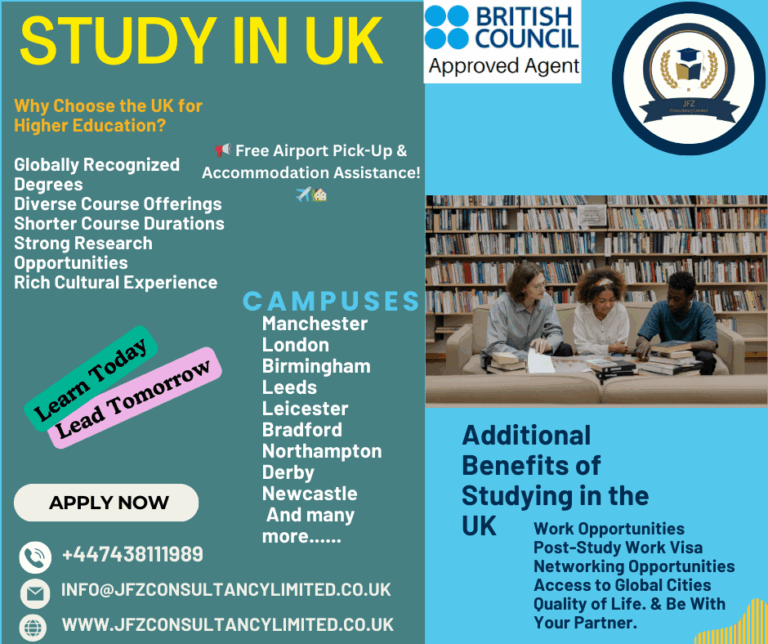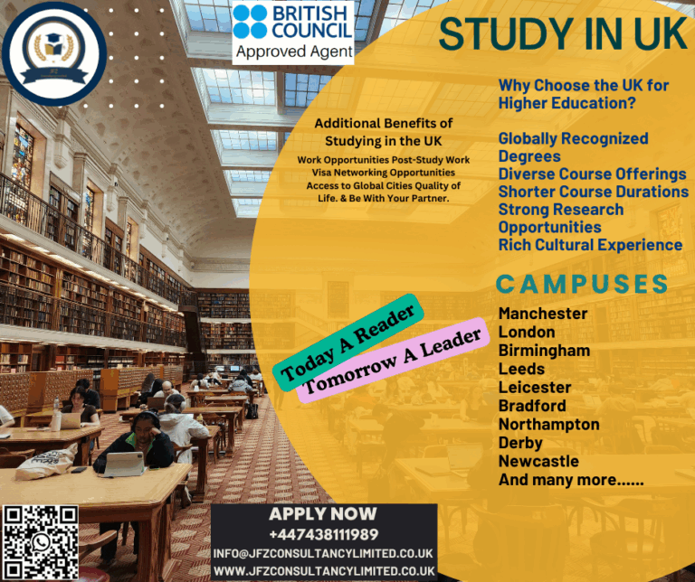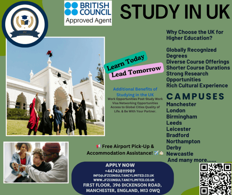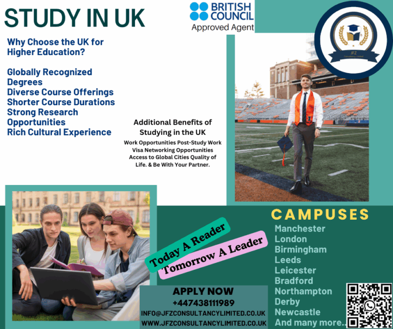 Do you want to pursue higher education abroad? Study Undergrad or post-graduation in the UK with a two-year work permit after graduation. Apply for the September 2025 Intake. Why JFZ Consultancy Limited? • One-to-one Free Consultation. • Free Advice on…