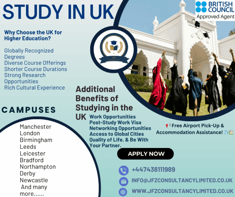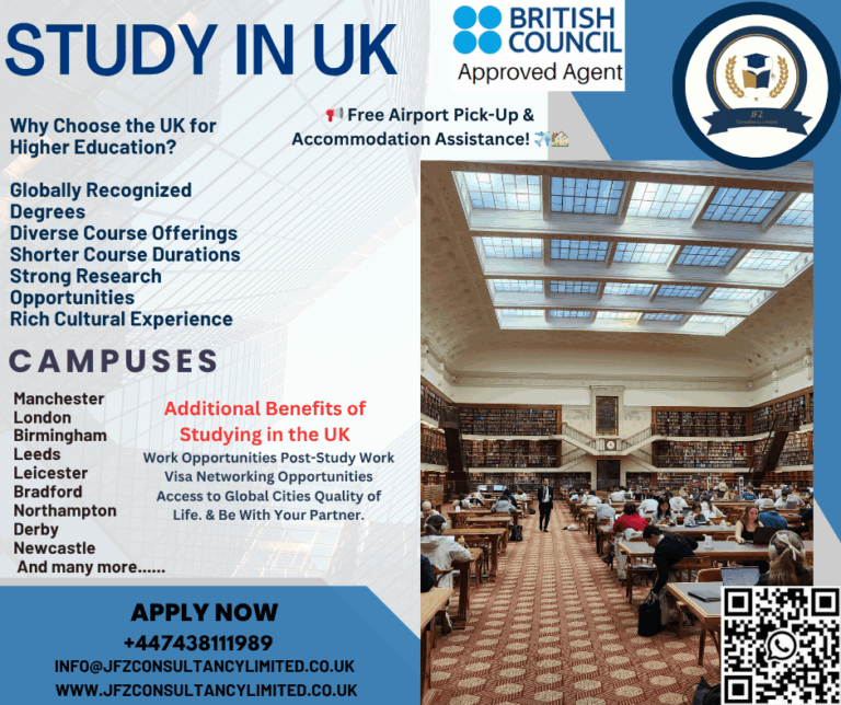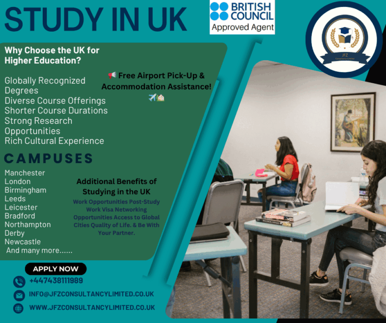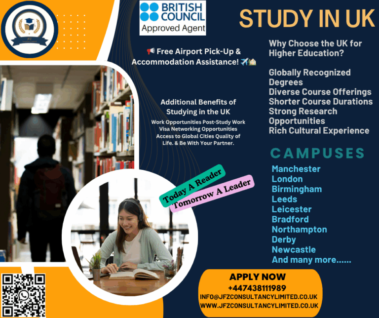 Do you want to pursue higher education abroad? Study Undergrad or post-graduation in the UK with a two-year work permit after graduation. Apply for the September 2025 Intake. Why JFZ Consultancy Limited? • One-to-one Free Consultation. • Free Advice on…