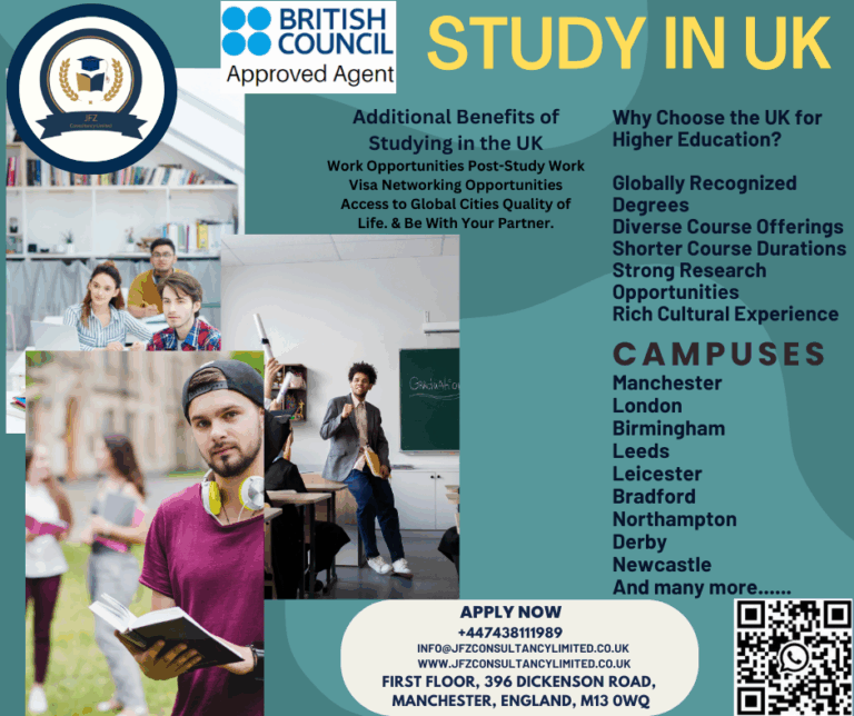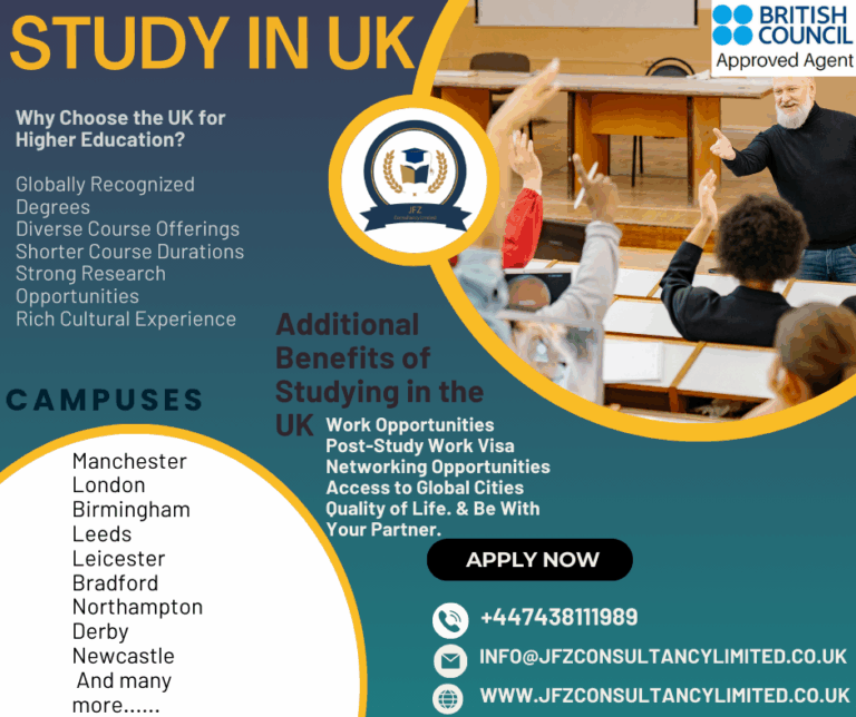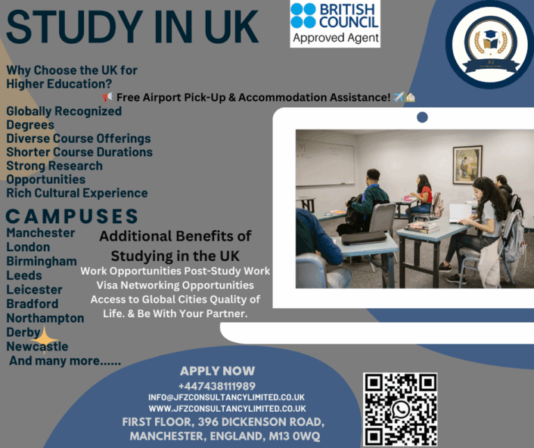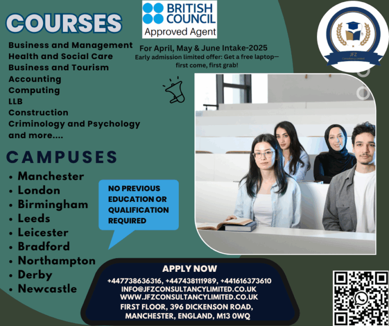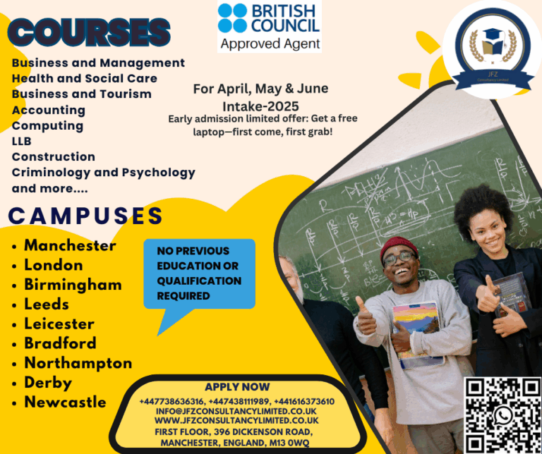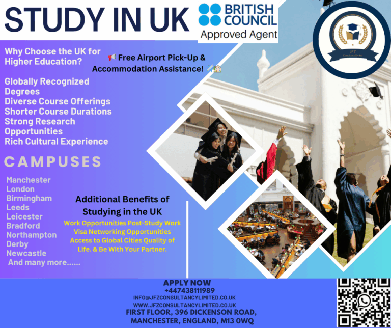 Do you want to pursue higher education abroad? Study Undergrad or post-graduation in the UK with a two-year work permit after graduation. Apply for the September 2025 Intake. Why JFZ Consultancy Limited? • One-to-one Free Consultation. • Free Advice on…